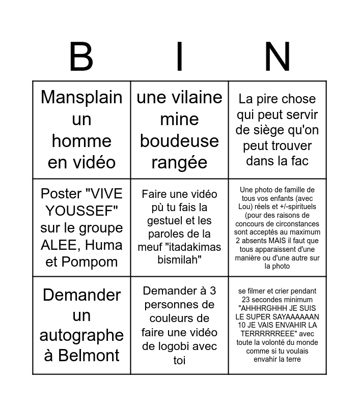 This bingo card has a free space and 8 words: Une photo de famille de tous vos enfants (avec Lou) réels et +/-spirituels (pour des raisons de concours de circonstances sont acceptés au maximum 2 absents MAIS il faut que tous apparaissent d'une manière ou d'une autre sur la photo, La pire chose qui peut servir de siège qu'on peut trouver dans la fac, une vilaine mine boudeuse rangée, Demander un autographe à Belmont, Mansplain un homme en vidéo, se filmer et crier pendant 23 secondes minimum "AHHHRGHHH JE SUIS LE SUPER SAYAAAAAAN 10 JE VAIS ENVAHIR LA TERRRRRREEE" avec toute la volonté du monde comme si tu voulais envahir la terre, Poster "VIVE YOUSSEF" sur le groupe ALEE, Huma et Pompom and Demander à 3 personnes de couleurs de faire une vidéo de logobi avec toi.