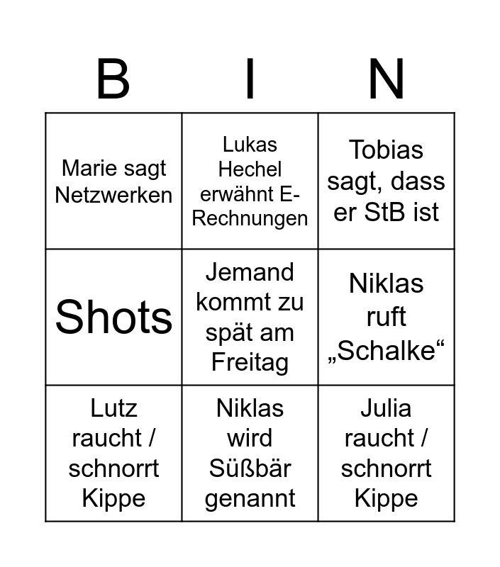 This bingo card has a free space and 8 words: Niklas ruft „Schalke“, Tobias sagt, dass er StB ist, Lukas Hechel erwähnt E-Rechnungen, Lutz raucht / schnorrt Kippe, Marie sagt Netzwerken, Julia raucht / schnorrt Kippe, Shots and Niklas wird Süßbär genannt.