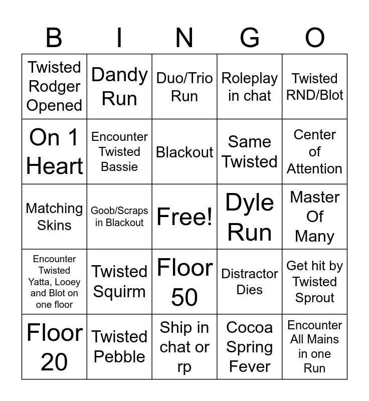 This bingo card has a free space and 24 words: Twisted Squirm, Twisted Pebble, Blackout, Floor 20, Twisted RND/Blot, Twisted Rodger Opened, On 1 Heart, Dandy Run, Dyle Run, Floor 50, Same Twisted, Matching Skins, Distractor Dies, Get hit by Twisted Sprout, Encounter Twisted Bassie, Cocoa Spring Fever, Master Of Many, Duo/Trio Run, Center of Attention, Goob/Scraps in Blackout, Encounter All Mains in one Run, Encounter Twisted Yatta, Looey and Blot on one floor, Roleplay in chat and Ship in chat or rp.