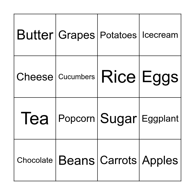 This bingo card has 26 words: Free!, Bread, Eggs, Milk, Cheese, Butter, Cucumbers, Grapes, Carrots, Onions, Tea, Sugar, Coffee, Free, Eggplant, Lettuce, Icecream, Apples, Potatoes, Chocolate, Popcorn, Pasta, Beans, Tuna, Rice and Flour.