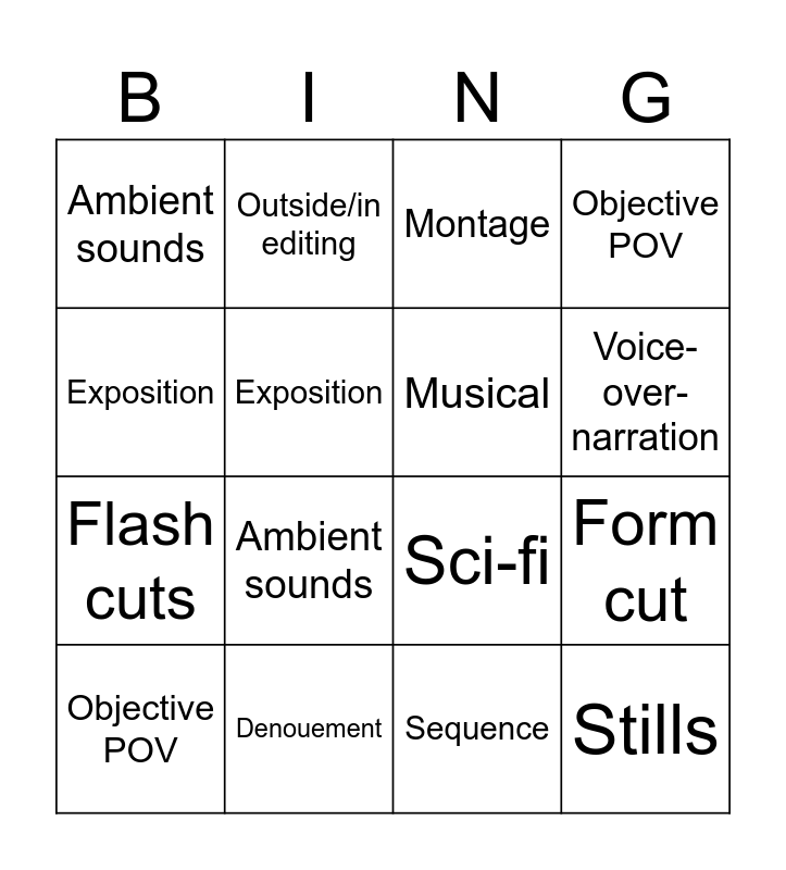 This bingo card has 116 words: Scene, Sequence, Establishing shot, Stills, Mise-en-scene, Value, Objective POV, Soft focus, Free!, Ambient sounds, Voice-over-narration, Form cut, Fade in/out, Outside/in editing, Inside/out editing, Glancing rhythms, Flash cuts, Cross cuts, Slow motion, Fast motion, Freeze frame, Montage, Scene, Sequence, Establishing shot, Stills, Mise-en-scene, Value, Objective POV, Soft focus, Ambient sounds, Voice-over-narration, Form cut, Fade in/out, Outside/in editing, Inside/out editing, Glancing rhythms, Flash cuts, Cross cuts, Slow motion, Fast motion, Freeze frame, Montage, Receptive viewership, Episodic plotline, Theme, Motif, Exposition, Rising action, Climax, Falling action, Denouement, In media res, Flashback, Dramatic foil, Internal conflict, External conflict, Allegory, Irony, Symbol, Allusion, Foreshadowing, Western, Genre film, Hood Classics, Horror, Comedy, Musical, Sci-fi, Scene, Sequence, Establishing shot, Stills, Mise-en-scene, Value, Objective POV, Soft focus, Ambient sounds, Voice-over-narration, Form cut, Fade in/out, Outside/in editing, Inside/out editing, Glancing rhythms, Flash cuts, Cross cuts, Slow motion, Fast motion, Freeze frame, Montage, Receptive viewership, Episodic plotline, Theme, Motif, Exposition, Rising action, Climax, Falling action, Denouement, In media res, Flashback, Dramatic foil, Internal conflict, External conflict, Allegory, Irony, Symbol, Allusion, Foreshadowing, Western, Genre film, Hood Classics, Horror, Comedy, Musical and Sci-fi.
