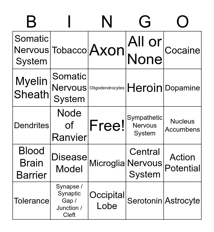 This bingo card has a free space and 24 words: Disease Model, Synapse / Synaptic Gap / Junction / Cleft, Oligodendrocytes, Tolerance, Cocaine, Somatic Nervous System, Myelin Sheath, Tobacco, Sympathetic Nervous System, Microglia, Heroin, Dendrites, Central Nervous System, Action Potential, Somatic Nervous System, Serotonin, Nucleus Accumbens, Axon, Dopamine, Node of Ranvier, Astrocyte, Blood Brain Barrier, All or None and Occipital Lobe.