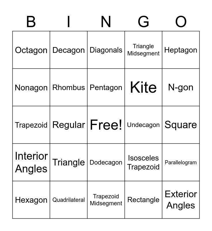This bingo card has a free space and 24 words: Triangle, Quadrilateral, Pentagon, Hexagon, Heptagon, Octagon, Nonagon, Decagon, Undecagon, Dodecagon, Kite, Trapezoid, Isosceles Trapezoid, Parallelogram, Rhombus, Rectangle, Square, Diagonals, N-gon, Regular, Exterior Angles, Interior Angles, Triangle Midsegment and Trapezoid Midsegment.