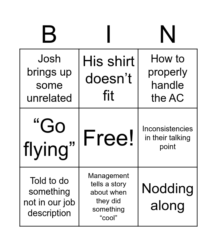 This bingo card has a free space and 18 words: ”, ”, How to properly handle the AC, Josh brings up some unrelated, Our issues get dismissed, “Go flying”, Our ideas get dismissed, His shirt doesn’t fit, Management tells a story about when they did something “cool”, Hand propping planes, Carb Ice, Nodding along, “You guys don’t actually know how to do your job”, Inconsistencies in their talking point, Told to do something not in our job description, We aren’t professional enough, How/when to sign out a student and New rules / policies get put into place but not enforced or told to anyone.
