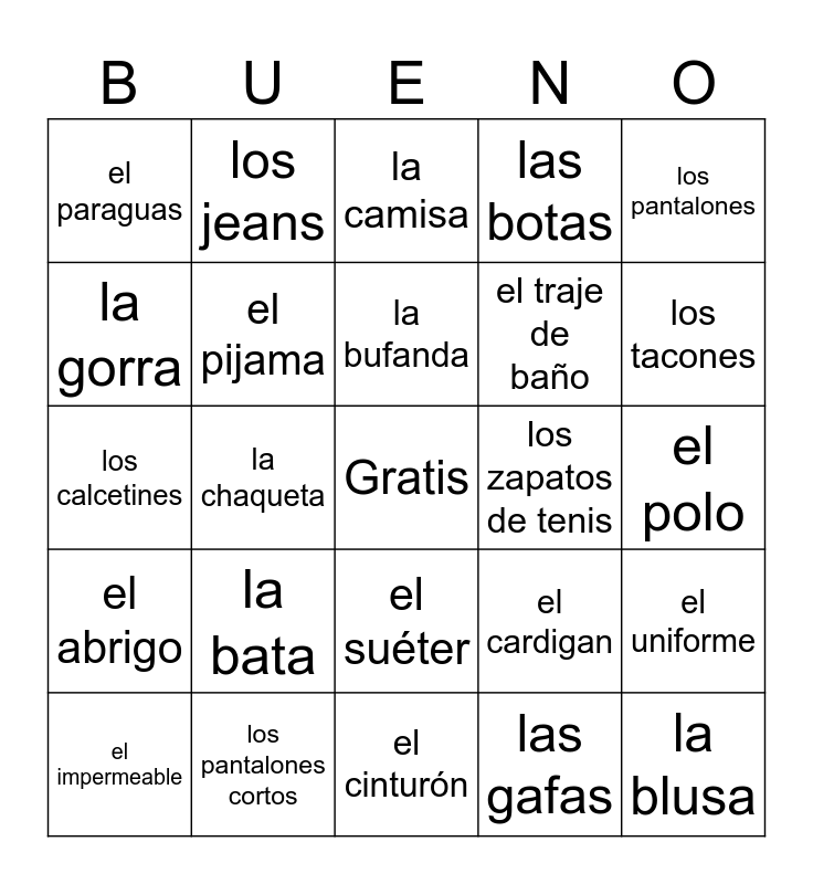 This bingo card has a free space and 33 words: el vestido, los guantes, la chaqueta, las orejeras, el abrigo, el pijama, los pantalones, el impermeable, los jeans, las sandalias, la bufanda, la camisa, la camiseta, los zapatos, los zapatos de tenis, los tacones, los pantalones cortos, los calcetines, la bata, el cardigan, el suéter, la corbata, el paraguas, el polo, el cinturón, la blusa, las botas, el traje de baño, la gorra, el uniforme, la sudadera, las gafas and las gafas de sol.