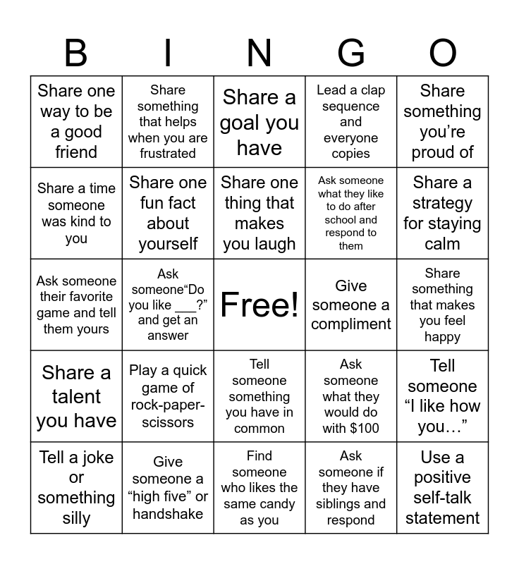 This bingo card has a free space and 24 words: Play a quick game of rock-paper-scissors, Give someone a “high five” or handshake, Share one thing that makes you laugh, Tell a joke or something silly, Share something you’re proud of, Share one way to be a good friend, Share a time someone was kind to you, Share something that helps when you are frustrated, Give someone a compliment, Tell someone something you have in common, Ask someone what they like to do after school and respond to them, Ask someone their favorite game and tell them yours, Ask someone what they would do with $100, Tell someone “I like how you…”, Share one fun fact about yourself, Ask someone if they have siblings and respond, Share something that makes you feel happy, Share a goal you have, Share a strategy for staying calm, Ask someone“Do you like ___?” and get an answer, Use a positive self-talk statement, Share a talent you have, Lead a clap sequence and everyone copies and Find someone who likes the same candy as you.