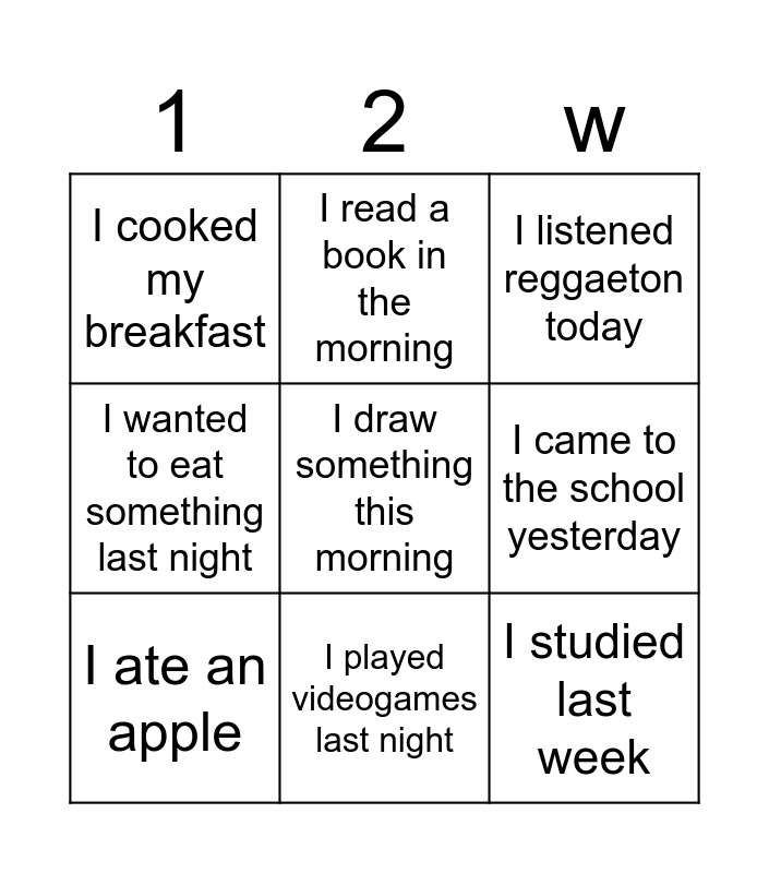 This bingo card has 12 words: I watched Youtube yesterday, I studied last week, I draw something this morning, I came to the school yesterday, I read a book in the morning, I listened reggaeton today, I played videogames last night, I did my homework, I cooked my breakfast, I wanted to eat something last night, I ate an apple and I visited my friend yesterday.