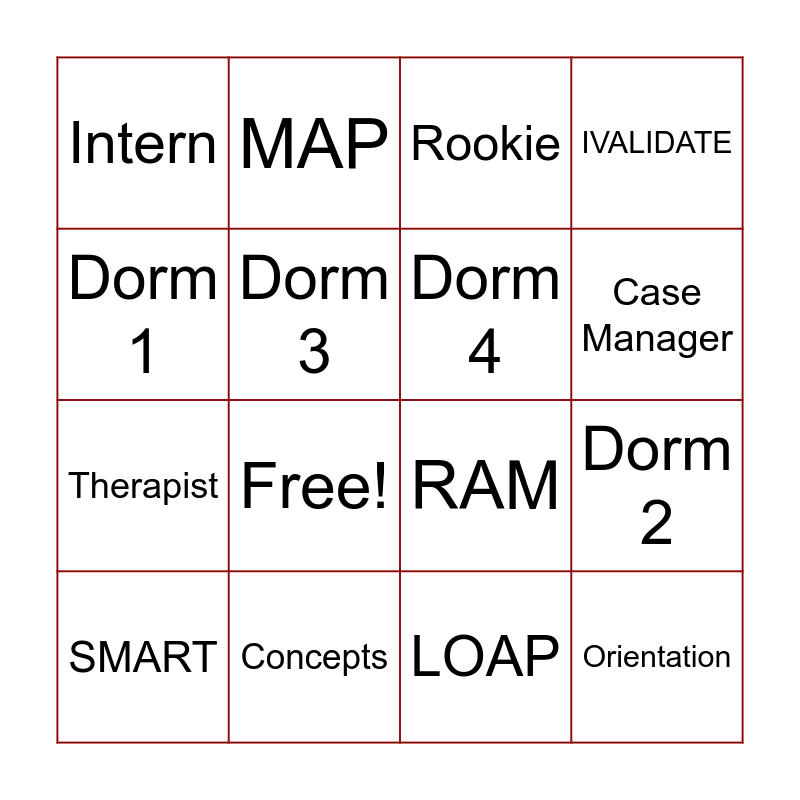 This bingo card has 18 words: Free!, Orientation, Rookie, Intern, RAM, IVALIDATE, SMART, MAP, Case Manager, Therapist, LOAP, Dorm 1, Dorm 2, Dorm 3, Dorm 4, Dorm 5, Concepts and Sign off's.
