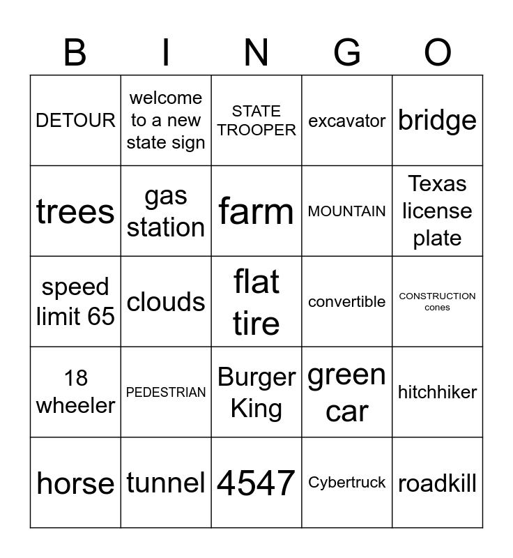 This bingo card has a free space and 24 words: PEDESTRIAN, tunnel, farm, horse, bridge, DETOUR, trees, welcome to a new state sign, convertible, Burger King, MOUNTAIN, speed limit 65, green car, hitchhiker, gas station, Cybertruck, CONSTRUCTION cones, STATE TROOPER, Texas license plate, clouds, roadkill, 18 wheeler, excavator and 4547.