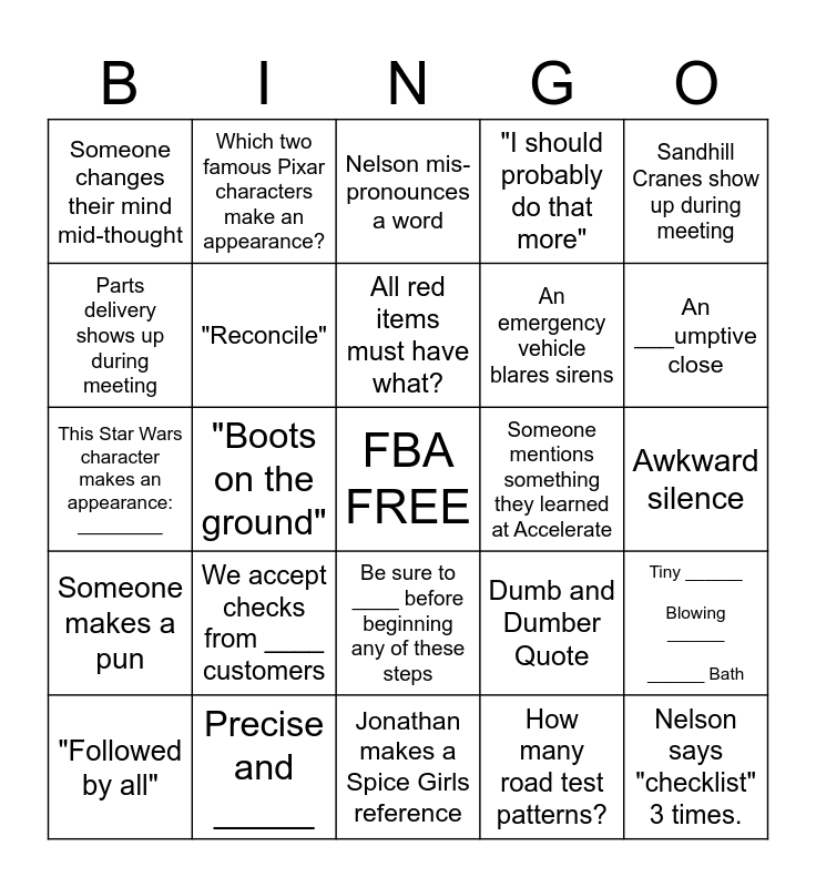 This bingo card has a free space and 29 words: "Followed by all", The 3 _____, "Boots on the ground", Customer shows up during meeting, Someone changes their mind mid-thought, Nelson mis-pronounces a word, "Reconcile", We accept checks from ____ customers, Someone mentions something they learned at Accelerate, Precise and _____, Awkward silence, Nelson says "checklist" 3 times., Jonathan makes a Spice Girls reference, How many road test patterns?, An ___umptive close, Nelson encounters a technical issue, Be sure to ____ before beginning any of these steps, Someone makes a pun, Sandhill Cranes show up during meeting, This Star Wars character makes an appearance: ________, Dumb and Dumber Quote, "Onion", An emergency vehicle blares sirens, Parts delivery shows up during meeting, "I should probably do that more", Which two famous Pixar characters make an appearance?, Tiny ______ Blowing ______ ______ Bath, All red items must have what? and "Rapport" is said 5 times.