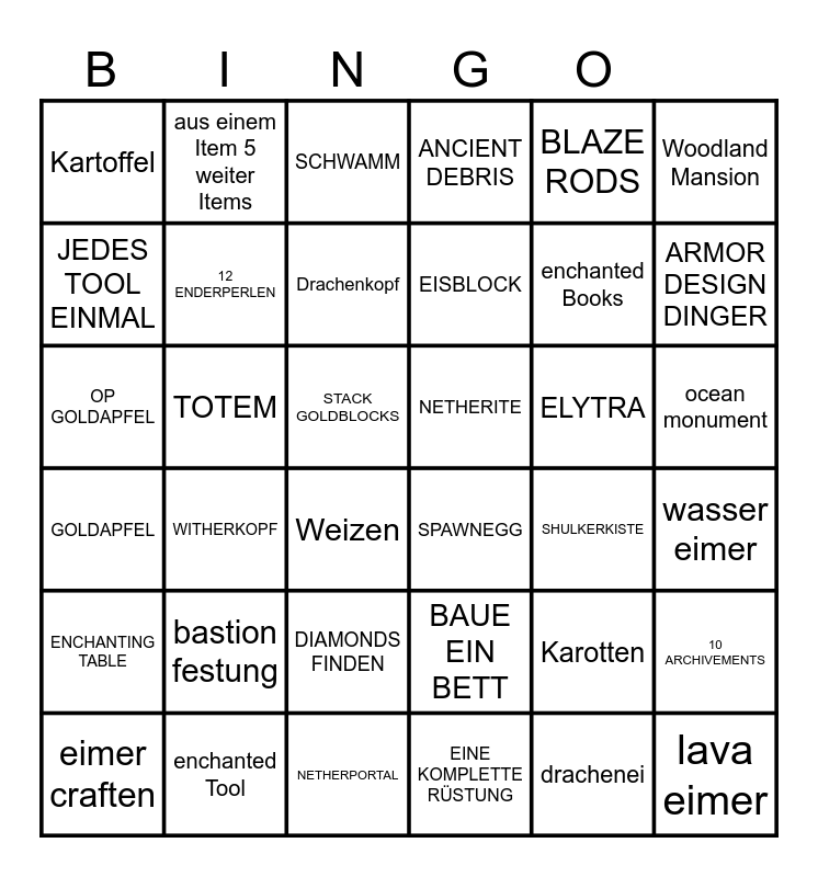 This bingo card has 36 words: BAUE EIN BETT, DIAMONDS FINDEN, EINE KOMPLETTE RÜSTUNG, JEDES TOOL EINMAL, GOLDAPFEL, NETHERITE, 12 ENDERPERLEN, NETHERPORTAL, BLAZE RODS, Karotten, ARMOR DESIGN DINGER, ANCIENT DEBRIS, 10 ARCHIVEMENTS, TOTEM, EISBLOCK, Kartoffel, ENCHANTING TABLE, ELYTRA, OP GOLDAPFEL, SCHWAMM, STACK GOLDBLOCKS, WITHERKOPF, SPAWNEGG, Weizen, SHULKERKISTE, aus einem Item 5 weiter Items, enchanted Books, enchanted Tool, Drachenkopf, Woodland Mansion, lava eimer, eimer craften, wasser eimer, ocean monument, bastion festung and drachenei.