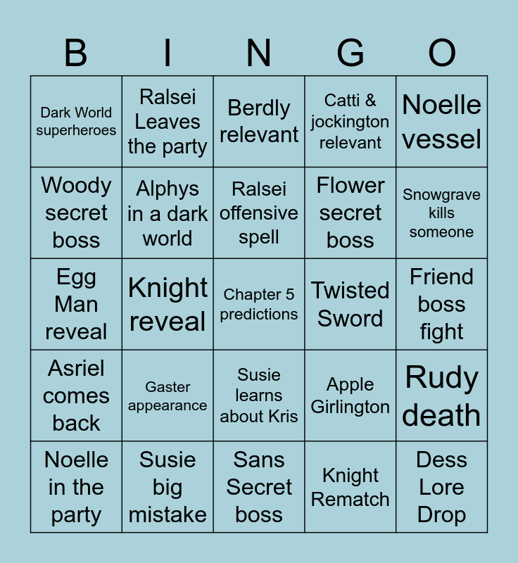 This bingo card has a free space and 24 words: Gaster appearance, Susie big mistake, Ralsei offensive spell, Noelle in the party, Noelle vessel, Dark World superheroes, Woody secret boss, Ralsei Leaves the party, Twisted Sword, Susie learns about Kris, Flower secret boss, Egg Man reveal, Apple Girlington, Rudy death, Alphys in a dark world, Knight Rematch, Friend boss fight, Berdly relevant, Snowgrave kills someone, Knight reveal, Dess Lore Drop, Asriel comes back, Catti & jockington relevant and Sans Secret boss.