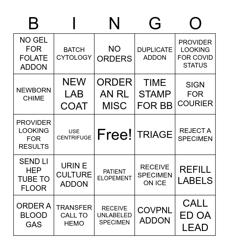 This bingo card has a free space and 24 words: URIN E CULTURE ADDON, TRANSFER CALL TO HEMO, ORDER AN RL MISC, ORDER A BLOOD GAS, PROVIDER LOOKING FOR COVID STATUS, NO GEL FOR FOLATE ADDON, NEWBORN CHIME, BATCH CYTOLOGY, TRIAGE, PATIENT ELOPEMENT, TIME STAMP FOR BB, PROVIDER LOOKING FOR RESULTS, RECEIVE SPECIMEN ON ICE, REFILL LABELS, NEW LAB COAT, COVPNL ADDON, REJECT A SPECIMEN, NO ORDERS, SIGN FOR COURIER, USE CENTRIFUGE, CALL ED OA LEAD, SEND LI HEP TUBE TO FLOOR, DUPLICATE ADDON and RECEIVE UNLABELED SPECIMEN.