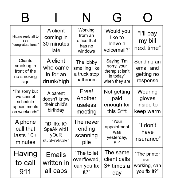 This bingo card has a free space and 33 words: A client yelling at you, “It’s urgent!” – Its not urgent, A parent doesn't know their child's birthday, A client who doesn’t know their therapist’s name, A phone call that lasts 10+ minutes, A client who came in for an drunk/high, “I'll pay my bill next time”, Having to call 911, A client coming in 30 minutes late, An animal that is definitely not a service animal, The lobby smelling like a truck stop bathroom, Working from an office that has no windows, Crying in the employee bathroom, Having a migraine always, Not getting paid enough for this S**t, Sending an email and getting no response, Emails written in all caps, “I’m sorry but we cannot schedule appointments on weekends”, “iD lIKe tO SpeAk wItH yOuR sUpErvIsoR”, “Your appointment was yesterday, Sir”, The never ending scanning pile, “It’s an emergency. My pen is out of ink”, Hitting reply all to say “congratulations!”, Wearing gloves inside to keep warm, “The toilet overflowed, can you fix it?”, “The printer isn’t working, can you fix it?”, “Would you like to leave a voicemail?”, Saying “I’m sorry, your therapist isn’t in today” when they are, Clients smoking in front of the no smoking sign, “I don’t have insurance”, Giving a client a fake name, The same client calls 3+ times a day and “The number you have dialed is not in service”.