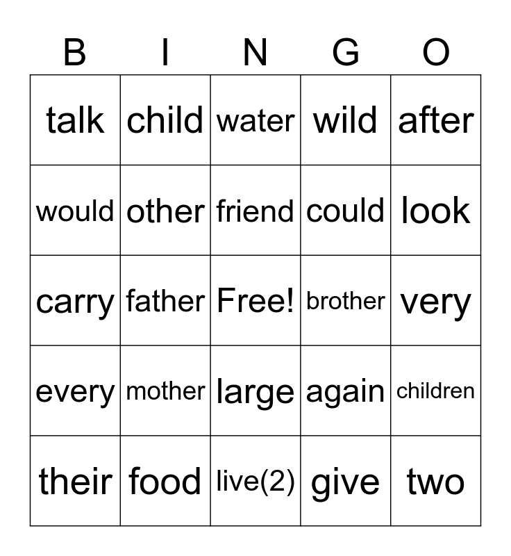 This bingo card has a free space and 29 words: their, to, father, walk, talk, water, other, mother, brother, food, very, two, live(2), give, look, been, large, every, after, carry, again, both, could, would, wild, child, children, friend and school.