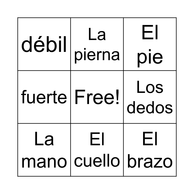 This bingo card has a free space and 11 words: La cabeza, El cuello, El brazo, La mano, La pierna, El pie, Los dedos, El hombro, fuerte, débil and doler.