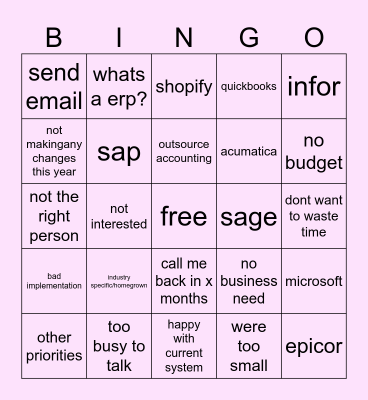This bingo card has a free space and 24 words: industry specific/homegrown, too busy to talk, outsource accounting, other priorities, infor, send email, not makingany changes this year, whats a erp?, sage, call me back in x months, acumatica, not the right person, no business need, microsoft, sap, were too small, dont want to waste time, shopify, no budget, not interested, epicor, bad implementation, quickbooks and happy with current system.
