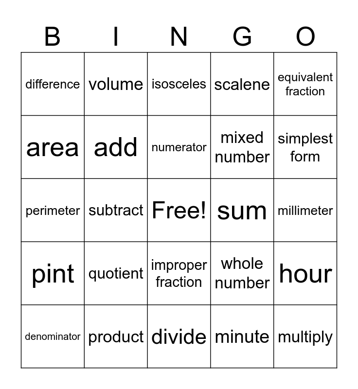 This bingo card has a free space and 24 words: quotient, product, numerator, denominator, equivalent fraction, difference, area, volume, sum, improper fraction, mixed number, perimeter, whole number, hour, add, minute, millimeter, isosceles, simplest form, subtract, multiply, pint, scalene and divide.