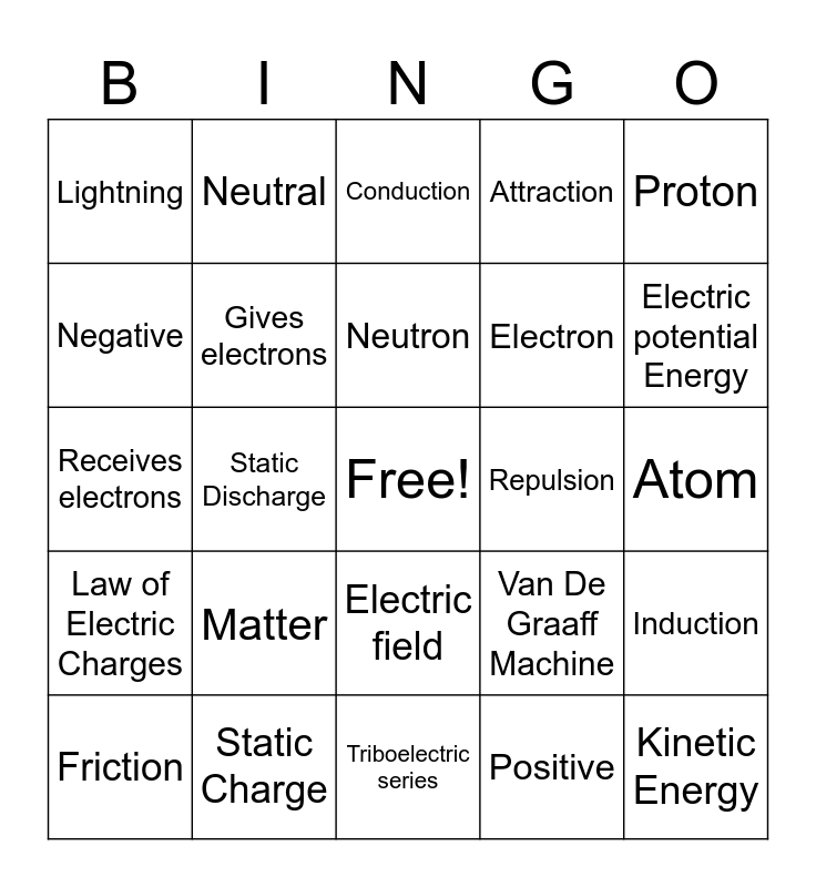 This bingo card has a free space and 25 words: Matter, Triboelectric series, Neutron, Friction, Proton, Lightning, Negative, Neutral, Repulsion, Electric field, Electron, Receives electrons, Van De Graaff Machine, Induction, Gives electrons, Electrical Force, Atom, Conduction, Electric potential Energy, Static Discharge, Kinetic Energy, Static Charge, Law of Electric Charges, Attraction and Positive.