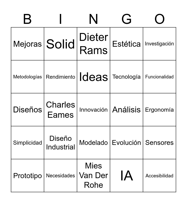 This bingo card has a free space and 24 words: Diseño Industrial, Necesidades, Ideas, Prototipo, Investigación, Mejoras, Metodologías, Solid, Análisis, Modelado, Tecnología, Diseños, Evolución, Sensores, Rendimiento, IA, Ergonomía, Dieter Rams, Funcionalidad, Charles Eames, Accesibilidad, Simplicidad, Estética and Mies Van Der Rohe.