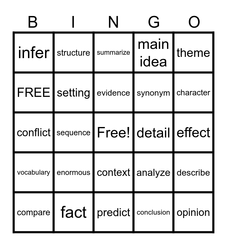 This bingo card has a free space and 25 words: enormous, predict, evidence, compare, theme, infer, FREE, structure, detail, context, synonym, conflict, analyze, describe, setting, cause, effect, summarize, character, sequence, opinion, fact, vocabulary, main idea and conclusion.