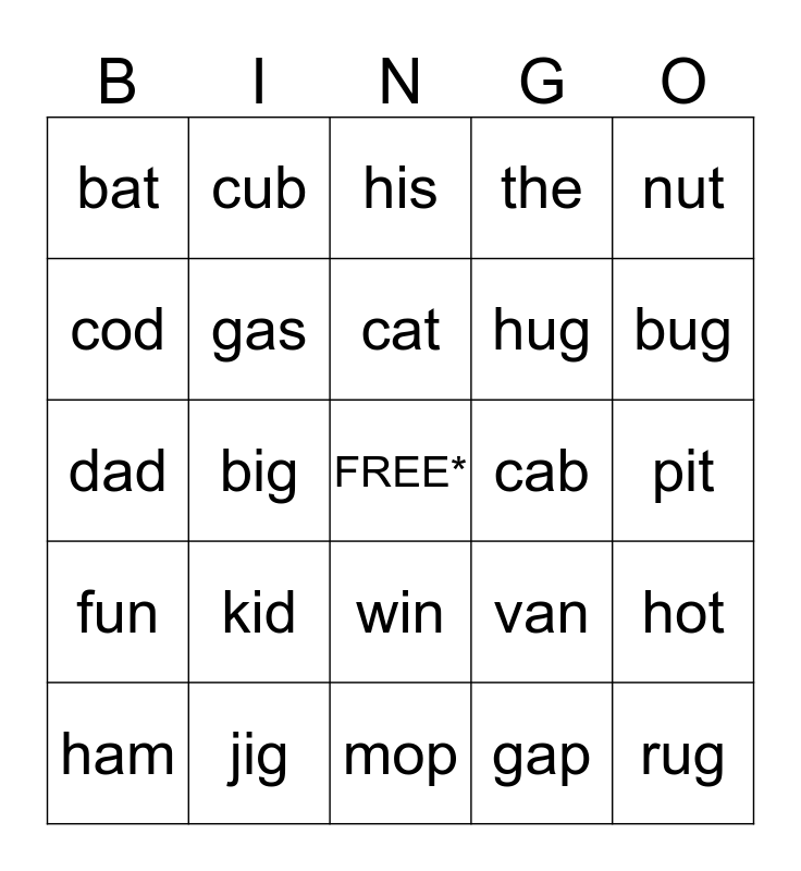 This bingo card has a free space and 24 words: kid, jig, cat, ham, nut, bat, cod, cub, cab, win, hug, dad, van, hot, gas, gap, pit, his, bug, big, rug, fun, the and mop.