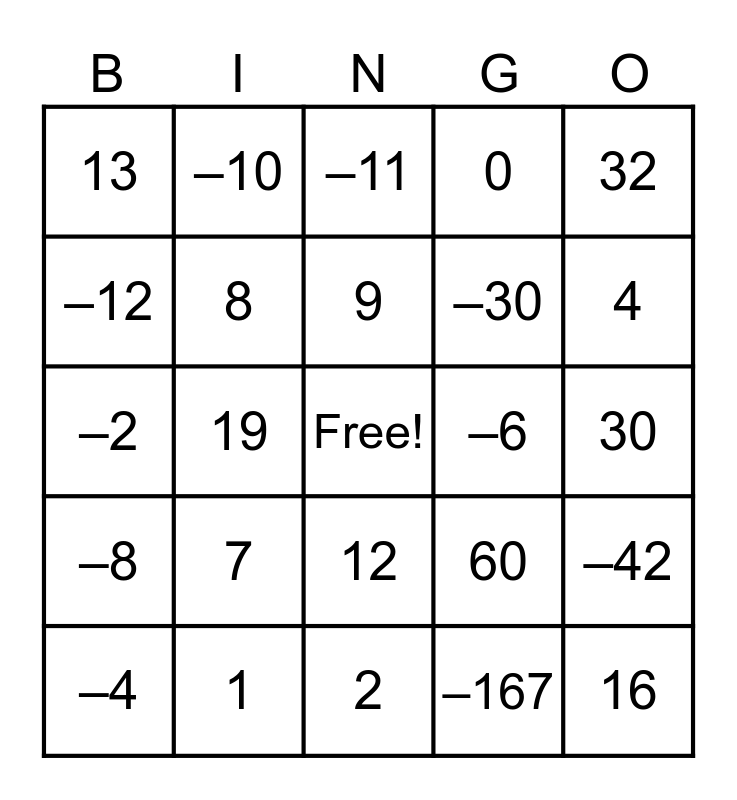This bingo card has a free space and 28 words: –42, –21, –30, –167, –12, –11, –10, –8, –6, –4, –2, 0, 1, 2, 4, 6, 7, 8, 9, 12, 13, 14, 16, 19, 30, 60, 32 and 57.