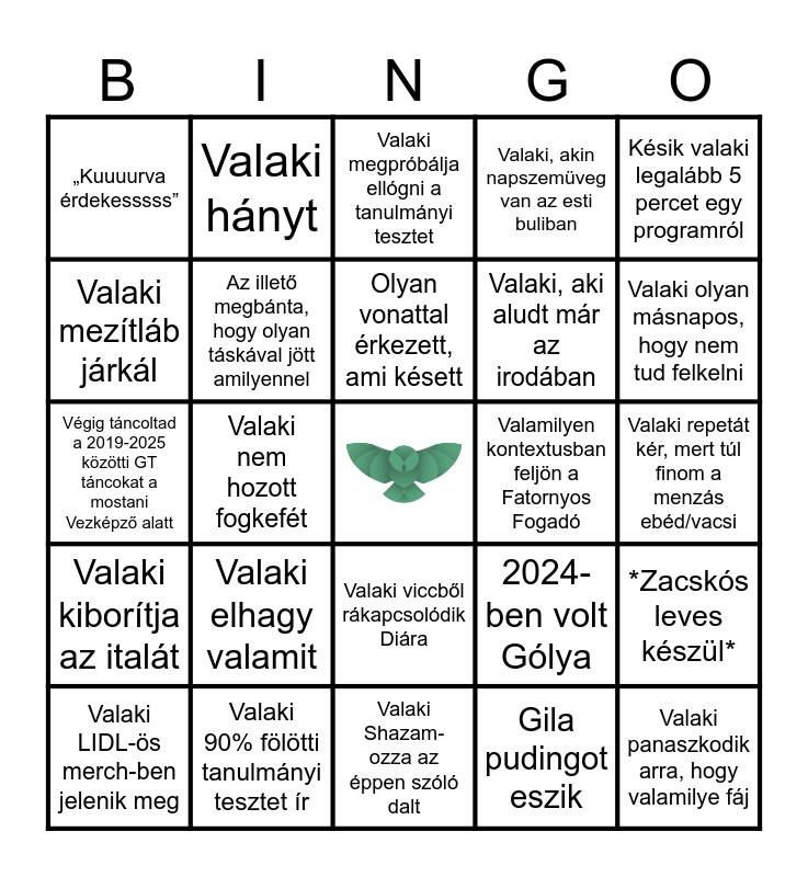 This bingo card has a free space and 24 words: Valaki LIDL-ös merch-ben jelenik meg, Valaki elhagy valamit, Olyan vonattal érkezett, ami késett, Gila pudingot eszik, Késik valaki legalább 5 percet egy programról, „Kuuuurva érdekesssss”, Valaki hányt, Valaki megpróbálja ellógni a tanulmányi tesztet, Valamilyen kontextusban feljön a Fatornyos Fogadó, Valaki repetát kér, mert túl finom a menzás ebéd/vacsi, Végig táncoltad a 2019-2025 közötti GT táncokat a mostani Vezképző alatt, Az illető megbánta, hogy olyan táskával jött amilyennel, 2024-ben volt Gólya, *Zacskós leves készül*, Valaki mezítláb járkál, Valaki 90% fölötti tanulmányi tesztet ír, Valaki Shazam-ozza az éppen szóló dalt, Valaki, akin napszemüveg van az esti buliban, Valaki olyan másnapos, hogy nem tud felkelni, Valaki kiborítja az italát, Valaki nem hozott fogkefét, Valaki viccből rákapcsolódik Diára, Valaki, aki aludt már az irodában and Valaki panaszkodik arra, hogy valamilye fáj.