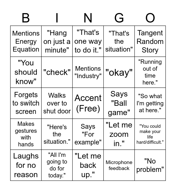 This bingo card has a free space and 25 words: "Here's the situation.", "Let me back up.", Mentions "Industry", Laughs for no reason, Tangent Random Story, Mentions Energy Equation, "You should know", "Hang on just a minute", Says "Ball game", Says "For example", "okay", Forgets to switch screen, "Let me zoom in.", "You could make your life hard/difficult.", "check", "Does everybody see what I'm doin?", "So what I'm getting at here.", "That's one way to do it.", "Running out of time here.", Walks over to shut door, "No problem", "All I'm going to do for today.", Makes gestures with hands, "That's the situation" and Microphone feedback.