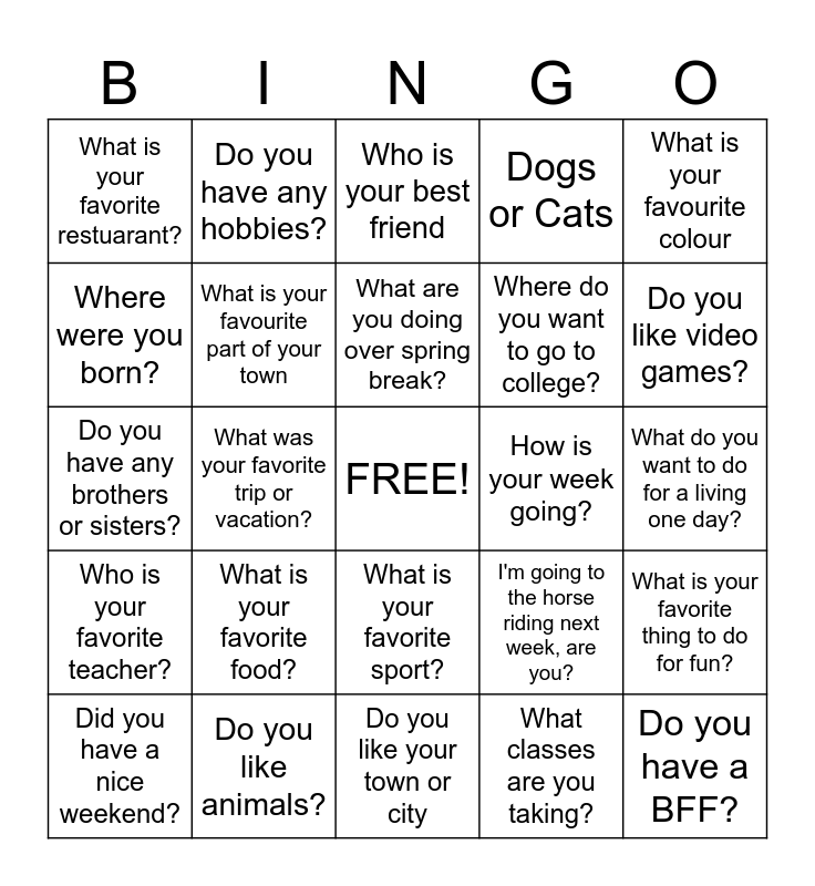 This bingo card has a free space and 24 words: What is your favorite food?, Do you like animals?, What are you doing over spring break?, Did you have a nice weekend?, What is your favourite colour, What is your favorite restuarant?, Where were you born?, Do you have any hobbies?, How is your week going?, What is your favorite sport?, Where do you want to go to college?, Do you have any brothers or sisters?, I'm going to the horse riding next week, are you?, What is your favorite thing to do for fun?, What is your favourite part of your town, What classes are you taking?, What do you want to do for a living one day?, Who is your best friend, Do you like video games?, What was your favorite trip or vacation?, Do you have a BFF?, Who is your favorite teacher?, Dogs or Cats and Do you like your town or city.