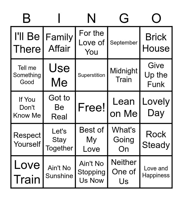 This bingo card has a free space and 24 words: Let's Stay Together, Ain't No Sunshine, Superstition, Love Train, Brick House, I'll Be There, Tell me Something Good, Family Affair, Lean on Me, Best of My Love, Midnight Train, If You Don't Know Me, What's Going On, Rock Steady, Use Me, Neither One of Us, Lovely Day, For the Love of You, Give Up the Funk, Got to Be Real, Love and Happiness, Respect Yourself, September and Ain't No Stopping Us Now.