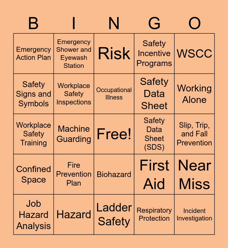 This bingo card has a free space and 29 words: Accident, Hazard, Risk, Personal Protective Equipment, WSCC, Emergency Action Plan, Workplace Safety Inspections, Occupational Illness, Safety Data Sheet (SDS), Near Miss, Job Hazard Analysis, Machine Guarding, Respiratory Protection, Incident Investigation, Workplace Safety Training, Workplace Violence, Ladder Safety, First Aid, Working Alone, Confined Space, Fire Prevention Plan, Safety, Safety Data Sheet, Slip, Trip, and Fall Prevention, Safety Signs and Symbols, Emergency Shower and Eyewash Station, Biohazard, Safety Incentive Programs and Occupational Health.