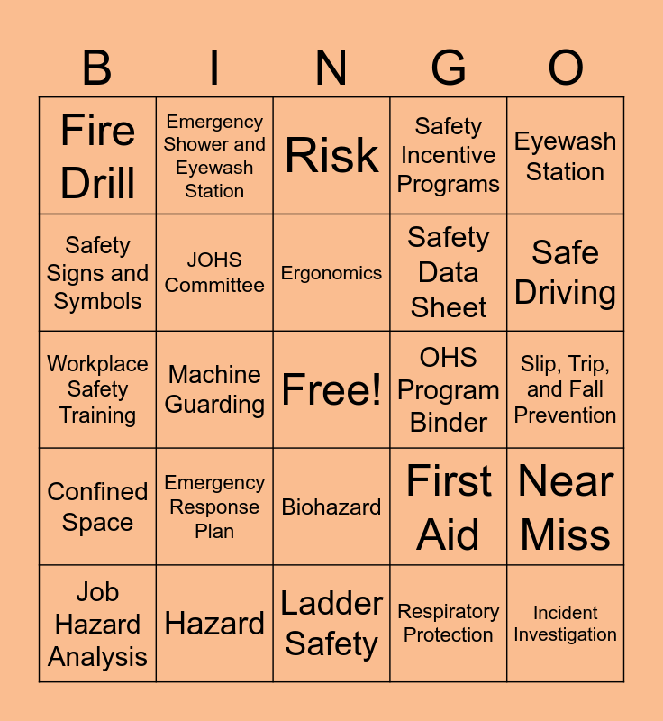 This bingo card has a free space and 29 words: Accident, Hazard, Risk, Personal Protective Equipment, Eyewash Station, Fire Drill, JOHS Committee, Ergonomics, OHS Program Binder, Near Miss, Job Hazard Analysis, Machine Guarding, Respiratory Protection, Incident Investigation, Workplace Safety Training, Respectful Workplace, Ladder Safety, First Aid, Safe Driving, Confined Space, Emergency Response Plan, Safety, Safety Data Sheet, Slip, Trip, and Fall Prevention, Safety Signs and Symbols, Emergency Shower and Eyewash Station, Biohazard, Safety Incentive Programs and Occupational Health.