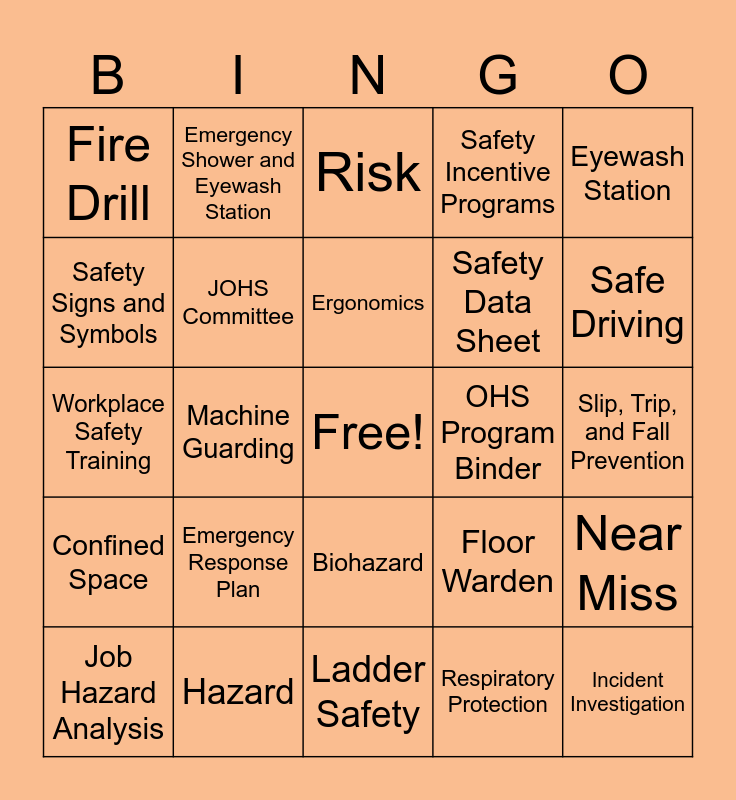 This bingo card has a free space and 29 words: Accident, Hazard, Risk, Personal Protective Equipment, Eyewash Station, Fire Drill, JOHS Committee, Ergonomics, OHS Program Binder, Near Miss, Job Hazard Analysis, Machine Guarding, Respiratory Protection, Incident Investigation, Workplace Safety Training, Respectful Workplace, Ladder Safety, Floor Warden, Safe Driving, Confined Space, Emergency Response Plan, Fall Protection, Safety Data Sheet, Slip, Trip, and Fall Prevention, Safety Signs and Symbols, Emergency Shower and Eyewash Station, Biohazard, Safety Incentive Programs and Occupational Health.