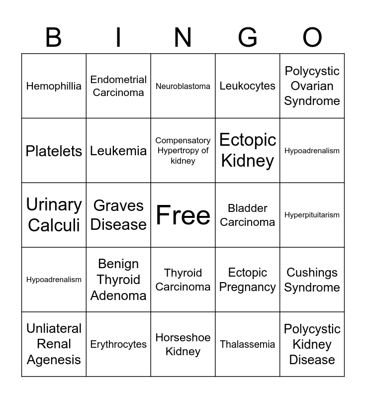 This bingo card has a free space and 30 words: Erythrocytes, Sickle Cell Anemia, Graves Disease, Hodgkins Lymphoma, Hemophillia, Neuroblastoma, Leukemia, Thyroid Carcinoma, Bladder Carcinoma, Horseshoe Kidney, Hyperpituitarism, Polycystic Kidney Disease, Thalassemia, Benign Prostatic Hyperplasia, Hypoadrenalism, Renal Duplication, Ectopic Pregnancy, Hypoadrenalism, Benign Thyroid Adenoma, Polycystic Ovarian Syndrome, Urinary Calculi, Seminomas, Endometrial Carcinoma, Ectopic Kidney, Platelets, Leukocytes, Cushings Syndrome, Unliateral Renal Agenesis, Compensatory Hypertropy of kidney and Cystitis.