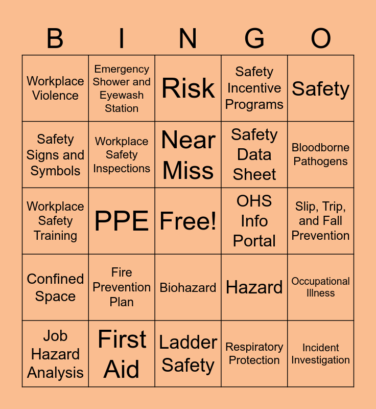 This bingo card has a free space and 29 words: Emergency Response Plan, First Aid, Risk, Personal Protective Equipment, Safety, Workplace Violence, Workplace Safety Inspections, Near Miss, OHS Info Portal, Occupational Illness, Job Hazard Analysis, PPE, Respiratory Protection, Incident Investigation, Workplace Safety Training, Accident, Ladder Safety, Hazard, Bloodborne Pathogens, Confined Space, Fire Prevention Plan, OSHA, Safety Data Sheet, Slip, Trip, and Fall Prevention, Safety Signs and Symbols, Emergency Shower and Eyewash Station, Biohazard, Safety Incentive Programs and Occupational Health.