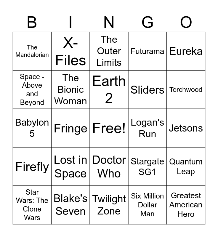This bingo card has a free space and 40 words: Amazing Stories, Babylon 5, Battlestar Galactica, The Bionic Woman, Blake's Seven, Doctor Who, Earth 2, Enterprise, Eureka, Firefly, Fringe, Futurama, Greatest American Hero, Jetsons, Logan's Run, Lost in Space, Lost Saucer, The Mandalorian, Mork & Mindy, The Outer Limits, Quantum Leap, Six Million Dollar Man, Sliders, Space - Above and Beyond, Space: 1999, Star Blazers, Star Trek - Original Series, Star Trek - The Next Generation, Star Trek Deep Space Nine, Star Trek the Animated Series, Star Trek Voyager, Star Wars: The Clone Wars, Stargate Atlantis, Stargate SG1, Torchwood, Twilight Zone, UFO, Ultraman, X-Files and 3rd Rock from the Sun.