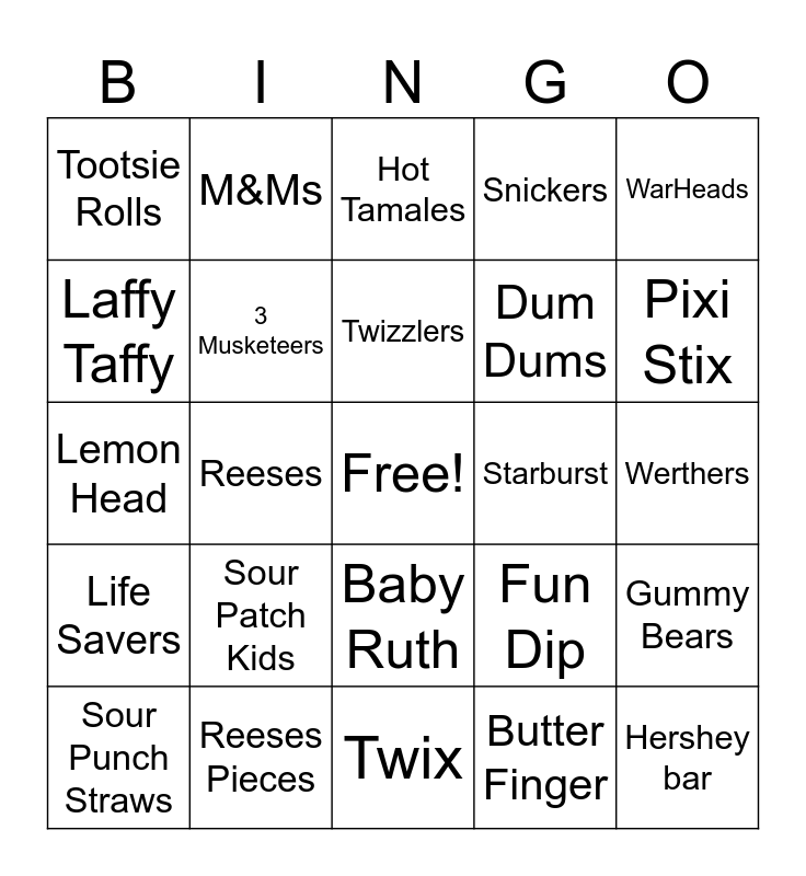This bingo card has a free space and 47 words: Kit-Kat, Hershey bar, Smarties, Twix, Sour Patch Kids, Skittles, M&Ms, AirHeads, Laffy Taffy, Milky Way, 3 Musketeers, Snickers, Gummy Bears, Fun Dip, SweetTarts, Jolly Ranchers, Twizzlers, Starburst, Rolo, WarHeads, Reeses, Butter Finger, Tootsie Rolls, Dum Dums, Blow Pop, Pixi Stix, Sour Punch Straws, Milk Duds, Baby Ruth, Life Savers, Bottle Caps, Pop Rocks, Pez, Pay Day, Junior Mints, Reeses Pieces, Werthers, Candy Corn, Mr. Good Bar, Charleston Chew, Dots, Hot Tamales, Lemon Head, Ring Pop, Swedish Fish, Nestle Crunch and Hershey Kisses.