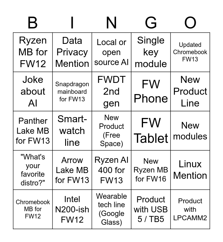 This bingo card has a free space and 24 words: Arrow Lake MB for FW13, Intel N200-ish FW12, FWDT 2nd gen, Chromebook MB for FW12, Updated Chromebook FW13, Ryzen MB for FW12, Joke about AI, Data Privacy Mention, FW Tablet, Ryzen AI 400 for FW13, FW Phone, Panther Lake MB for FW13, New Ryzen MB for FW16, Linux Mention, Snapdragon mainboard for FW13, Product with USB 5 / TB5, New modules, Local or open source AI, New Product Line, Smart-watch line, Product with LPCAMM2, "What's your favorite distro?", Single key module and Wearable tech line (Google Glass).