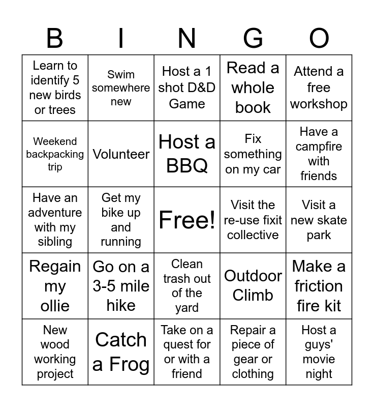 This bingo card has a free space and 24 words: Go on a 3-5 mile hike, Catch a Frog, Host a BBQ, New wood working project, Attend a free workshop, Learn to identify 5 new birds or trees, Weekend backpacking trip, Swim somewhere new, Visit the re-use fixit collective, Clean trash out of the yard, Fix something on my car, Have an adventure with my sibling, Outdoor Climb, Make a friction fire kit, Volunteer, Repair a piece of gear or clothing, Visit a new skate park, Host a 1 shot D&D Game, Have a campfire with friends, Get my bike up and running, Host a guys' movie night, Regain my ollie, Read a whole book and Take on a quest for or with a friend.