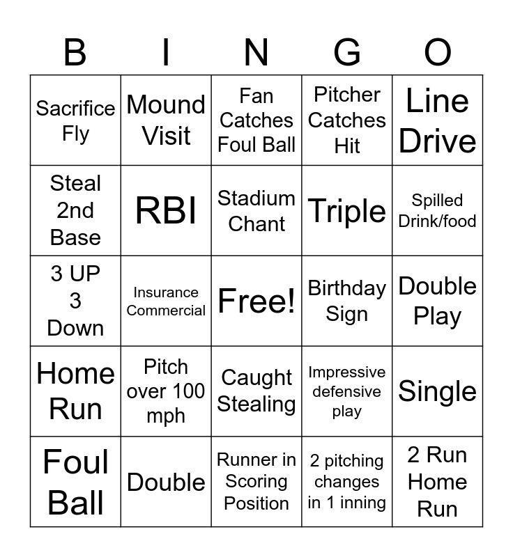 This bingo card has a free space and 34 words: Flashing Lights, 2 pitching changes in 1 inning, Kiss Cam, Video showing kids, Home Run, RBI, Line Drive, Foul Ball, Mound Visit, Error, Stadium Chant, Fan Catches Foul Ball, Overturned ABS call, Sleeping Baby, Birthday Sign, Spilled Drink/food, Double, 3 UP 3 Down, Pitch over 100 mph, Impressive defensive play, Caught Stealing, Hit by Pitch, Sacrifice Fly, Double Play, Runner in Scoring Position, 2 Run Home Run, Pitcher Catches Hit, Grand Slam, Triple, Steal 2nd Base, Checked Swing, Insurance Commercial, Single and Force Out.