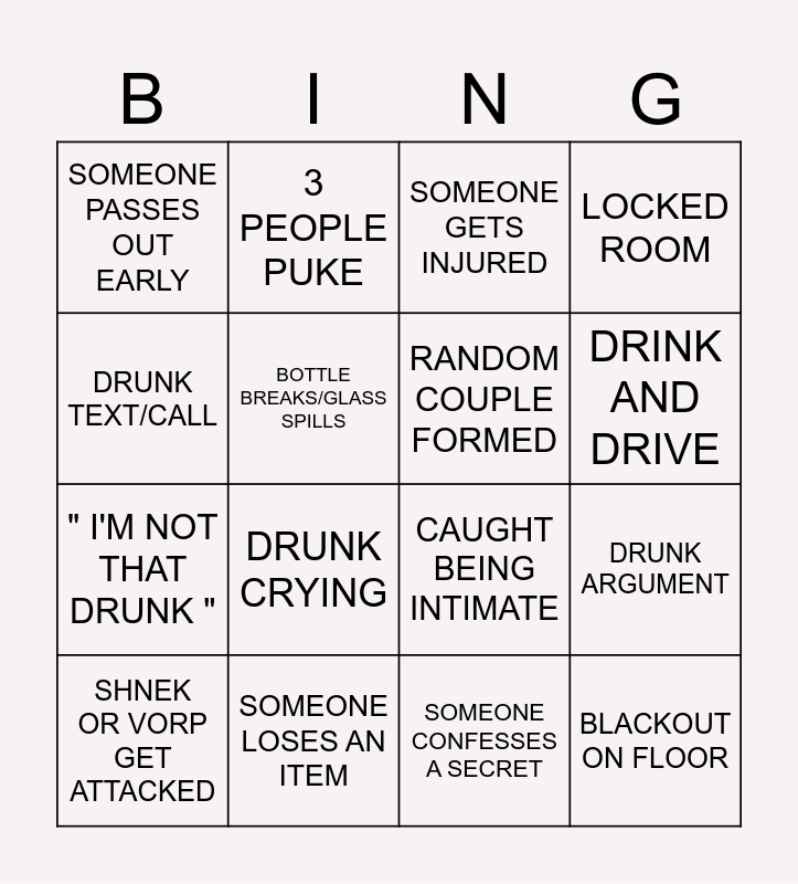 This bingo card has 16 words: SOMEONE LOSES AN ITEM, DRUNK ARGUMENT, SOMEONE GETS INJURED, SOMEONE PASSES OUT EARLY, " I'M NOT THAT DRUNK ", 3 PEOPLE PUKE, CAUGHT BEING INTIMATE, SOMEONE CONFESSES A SECRET, DRUNK TEXT/CALL, BOTTLE BREAKS/GLASS SPILLS, SHNEK OR VORP GET ATTACKED, LOCKED ROOM, DRUNK CRYING, DRINK AND DRIVE, RANDOM COUPLE FORMED and BLACKOUT ON FLOOR.