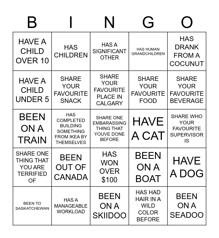 This bingo card has a free space and 24 words: BEEN TO SASKATCHEWAN, BEEN OUT OF CANADA, SHARE YOUR FAVOURITE PLACE IN CALGARY, HAS HAD HAIR IN A WILD COLOR BEFORE, HAS DRANK FROM A COCUNUT, HAVE A CHILD OVER 10, HAS CHILDREN, HAS A SIGNIFICANT OTHER, HAVE A CAT, SHARE WHO YOUR FAVOURITE SUPERVISOR IS, BEEN ON A TRAIN, SHARE YOUR FAVOURITE SNACK, BEEN ON A BOAT, HAVE A DOG, HAVE A CHILD UNDER 5, HAS A MANAGEABLE WORKLOAD, BEEN ON A SKIIDOO, HAS HUMAN GRANDCHILDREN, SHARE YOUR FAVOURITE BEVERAGE, SHARE ONE THING THAT YOU ARE TERRIFIED OF, HAS COMPLETED BUILDING SOMETHING FROM IKEA BY THEMSELVES, HAS WON OVER $100, SHARE YOUR FAVOURITE FOOD and BEEN ON A SEADOO.