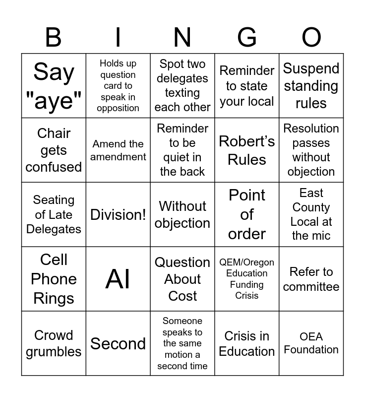 This bingo card has a free space and 53 words: Banquet, OEA Foundation, OEA PAC, Crisis in Education, AI, ICE, Holds up question card to speak in opposition, “first time delegate”, Chair gets confused, Motion to amend, Amend the amendment, Call the question!, Refer to committee, QEM/Oregon Education Funding Crisis, Refer to Parliamentarian, Crowd grumbles, Reminder to be quiet in the back, Point of order, Move to Close Debate, Suspend standing rules, Division!, Out of order, Robert’s Rules, Say "aye", Say "nay", Second, “friendly amendment”, Point of Personal Privilege, Robert’s Rules snafu results in second vote count, Resolution passes without objection, Someone states the same thing as the person before them, Someone accidentally speaks to previous motion, Someone obviously falls asleep, Expletive stated into mic, Attempt to pass motion while amendment is being voted on, Excessively detailed wordsmithing, Reminder to state your local, Someone speaks to the same motion a second time, Spot two delegates texting each other, Hear a loud yawn, Microphone line longer than 10 people, REA to the mic, East County Local at the mic, Valerie for Region 1 VP, Delegate says "I motion", Question About Cost, Pulled NBI, Credential Committee Report, Seating of Late Delegates, Cell Phone Rings, OEA Retired, First Time Delegate and Refer to OEA Legal.