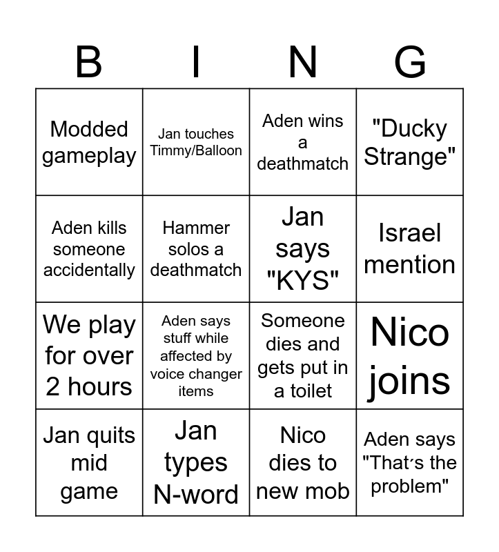 This bingo card has 16 words: Jan types N-word, Nico joins, Aden wins a deathmatch, Modded gameplay, We play for over 2 hours, Jan touches Timmy/Balloon, Someone dies and gets put in a toilet, Nico dies to new mob, Aden kills someone accidentally, Hammer solos a deathmatch, Jan quits mid game, "Ducky Strange", Aden says stuff while affected by voice changer items, Israel mention, Jan says "KYS" and Aden says "That ́s the problem".