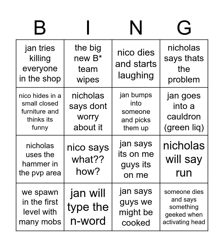 This bingo card has 16 words: jan will type the n-word, nicholas will say run, nico dies and starts laughing, jan tries killing everyone in the shop, nicholas uses the hammer in the pvp area, the big new B* team wipes, jan says its on me guys its on me, jan says guys we might be cooked, nico hides in a small closed furniture and thinks its funny, nicholas says dont worry about it, we spawn in the first level with many mobs, nicholas says thats the problem, nico says what?? how?, jan goes into a cauldron (green liq), jan bumps into someone and picks them up and someone dies and says something geeked when activating head.