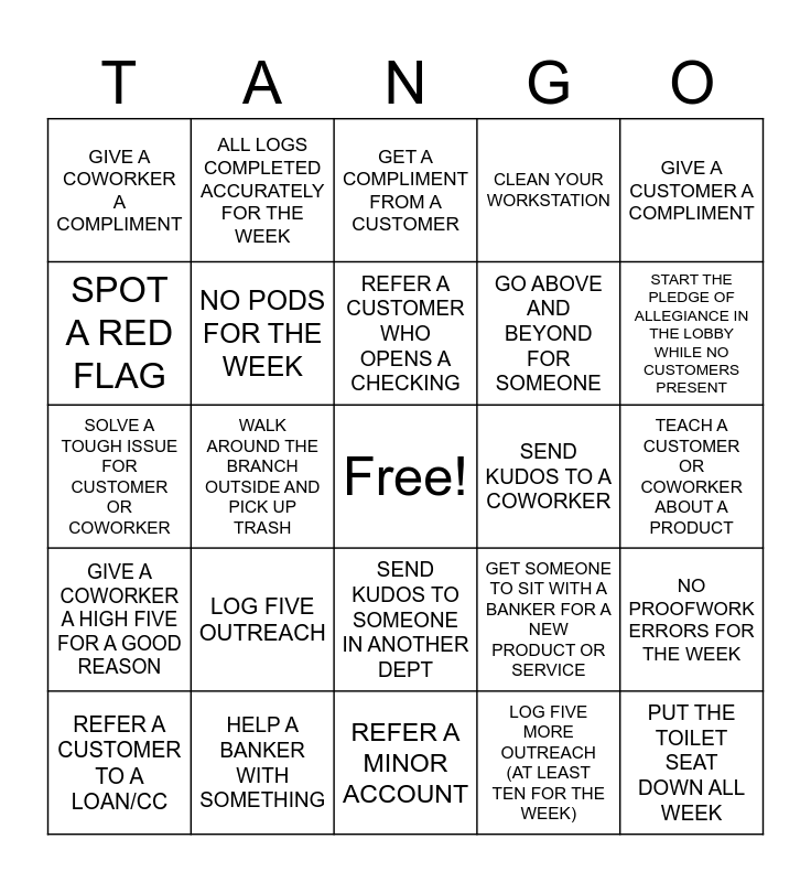 This bingo card has a free space and 24 words: LOG FIVE OUTREACH, HELP A BANKER WITH SOMETHING, REFER A CUSTOMER WHO OPENS A CHECKING, REFER A CUSTOMER TO A LOAN/CC, GIVE A CUSTOMER A COMPLIMENT, GIVE A COWORKER A COMPLIMENT, SPOT A RED FLAG, ALL LOGS COMPLETED ACCURATELY FOR THE WEEK, SEND KUDOS TO A COWORKER, SEND KUDOS TO SOMEONE IN ANOTHER DEPT, GO ABOVE AND BEYOND FOR SOMEONE, SOLVE A TOUGH ISSUE FOR CUSTOMER OR COWORKER, GET SOMEONE TO SIT WITH A BANKER FOR A NEW PRODUCT OR SERVICE, NO PROOFWORK ERRORS FOR THE WEEK, NO PODS FOR THE WEEK, LOG FIVE MORE OUTREACH (AT LEAST TEN FOR THE WEEK), TEACH A CUSTOMER OR COWORKER ABOUT A PRODUCT, GET A COMPLIMENT FROM A CUSTOMER, START THE PLEDGE OF ALLEGIANCE IN THE LOBBY WHILE NO CUSTOMERS PRESENT, WALK AROUND THE BRANCH OUTSIDE AND PICK UP TRASH, PUT THE TOILET SEAT DOWN ALL WEEK, GIVE A COWORKER A HIGH FIVE FOR A GOOD REASON, CLEAN YOUR WORKSTATION and REFER A MINOR ACCOUNT.