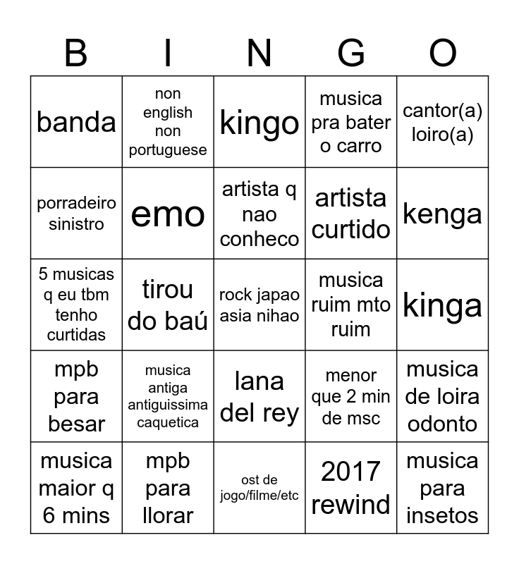 This bingo card has 25 words: musica antiga antiguissima caquetica, ost de jogo/filme/etc, artista q nao conheco, musica maior q 6 mins, cantor(a) loiro(a), banda, porradeiro sinistro, non english non portuguese, musica ruim mto ruim, lana del rey, artista curtido, 5 musicas q eu tbm tenho curtidas, menor que 2 min de msc, musica de loira odonto, emo, musica para insetos, kinga, kingo, kenga, tirou do baú, rock japao asia nihao, mpb para llorar, mpb para besar, musica pra bater o carro and 2017 rewind.