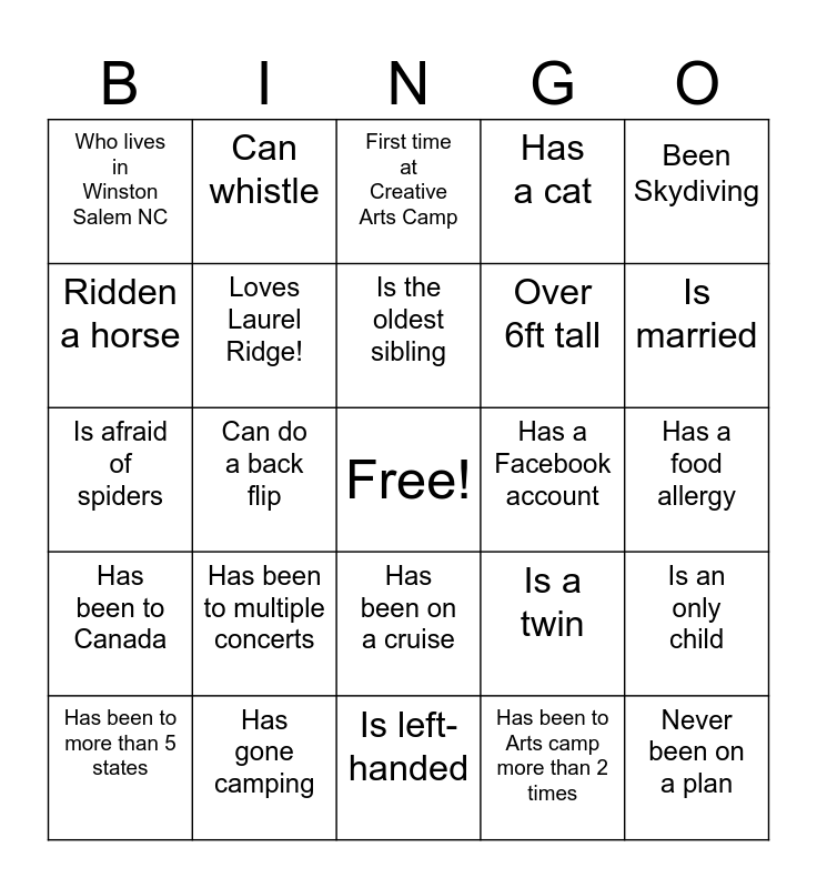 This bingo card has a free space and 29 words: Has been to more than 5 states, Has 2 dogs, Can do a back flip, Lives on a farm, Who lives in Winston Salem NC, First time at Creative Arts Camp, Loves Laurel Ridge!, Has been to multiple concerts, Has a Facebook account, Has gone camping, Has a food allergy, Never been on a plan, Is left-handed, Has been to Arts camp more than 2 times, Is married, Can touch their toes, Has been on a cruise, Has been to Canada, Been Skydiving, Is afraid of spiders, Is a twin, Has/had braces, Over 6ft tall, Ridden a horse, Has a cat, Can whistle, Is an only child, Is the oldest sibling and Can juggle.