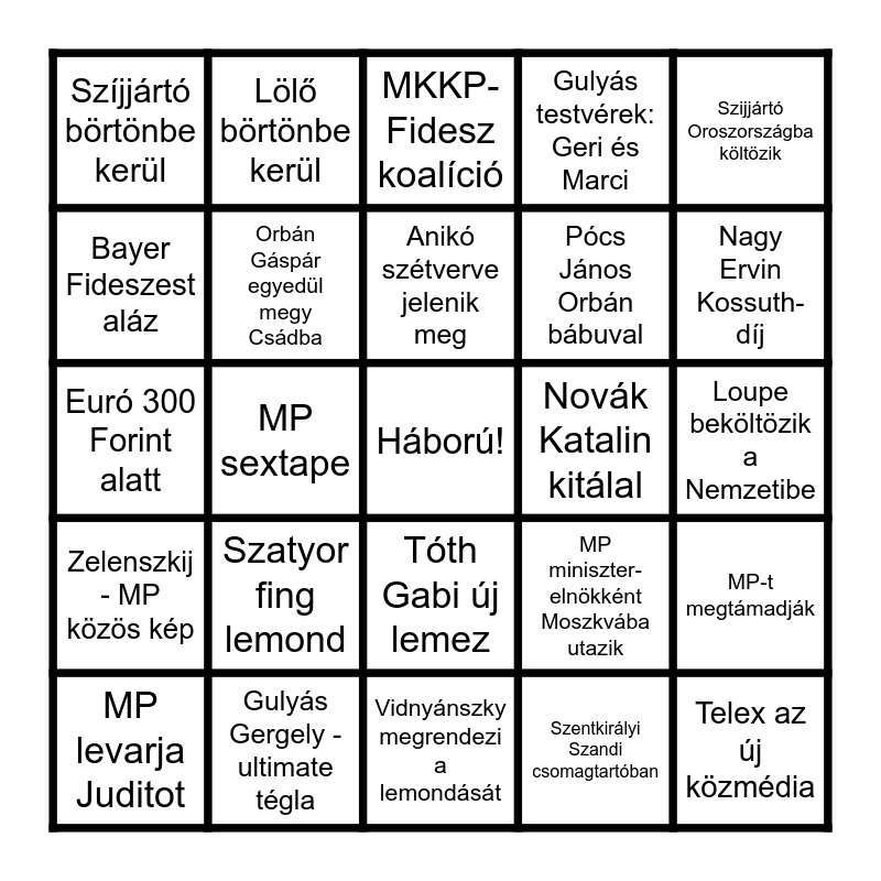 This bingo card has a free space and 44 words: Lölő és Andi szakít, Telex az új közmédia, Gyurcsány visszatér, MP levarja Juditot, MP-RM-VJ tricikli, Szentkirályi Szandi csomagtartóban, MKKP-Fidesz koalíció, Iványi köztársasági elnök, Szijjártó Oroszországba költözik, Gulyás Gergely - ultimate tégla, Gulyás testvérek: Geri és Marci, Novák Katalin kitálal, Tóth Gabi új lemez, Szatyor fing lemond, Lázár börtönbe kerül, Vidnyánszky megrendezi a lemondását, Deutsch börtönbe kerül, Euró 300 Forint alatt, Matolcsy börtönbe kerül, Nagy Ervin Kossuth-díj, Lölő börtönbe kerül, Rogán börtönbe kerül, Zsolti bácsi kiderül, Szíjjártó börtönbe kerül, Molnár Áron egyetért a Fidesszel, Loupe beköltözik a Nemzetibe, Nemzeti konzultáció, Új (fiatal) Fideszesek, MP miniszter-elnökként Moszkvába utazik, Zelenszkij - MP közös kép, Fidesz sextape, MP-t megtámadják, Orbán lemond, Megafon becsődöl, MP sextape, Toroczkai kart lendít, Nagy Feró-tól elveszik a Kossuth díjjat, Fideszes menekül, Anikó szétverve jelenik meg, Bayer Fideszest aláz, Pócs János Orbán bábuval, Csete Beátát kirúgják, Orbán Gáspár egyedül megy Csádba and Orbán Balázs bemárt mindenkit.